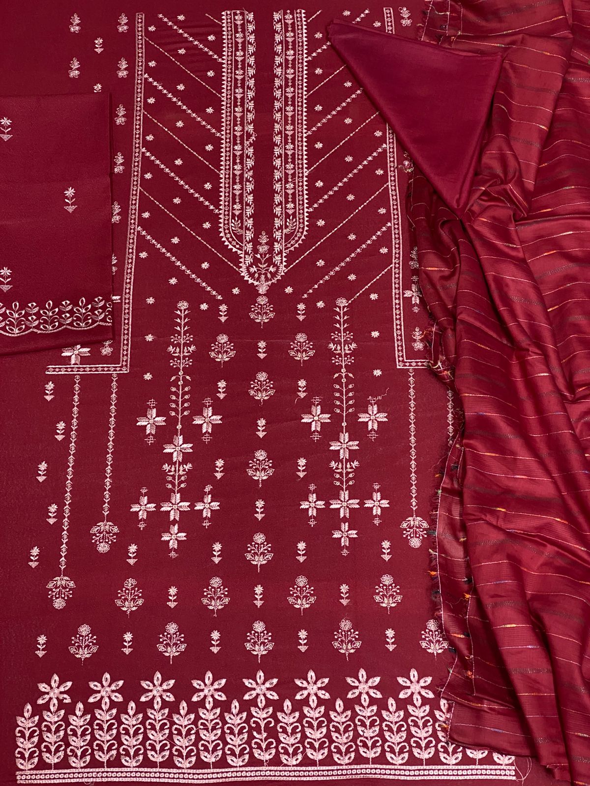Bin Saeed Luxury Wine Red Karandi 3Pc Embroidered Suit – Design 01