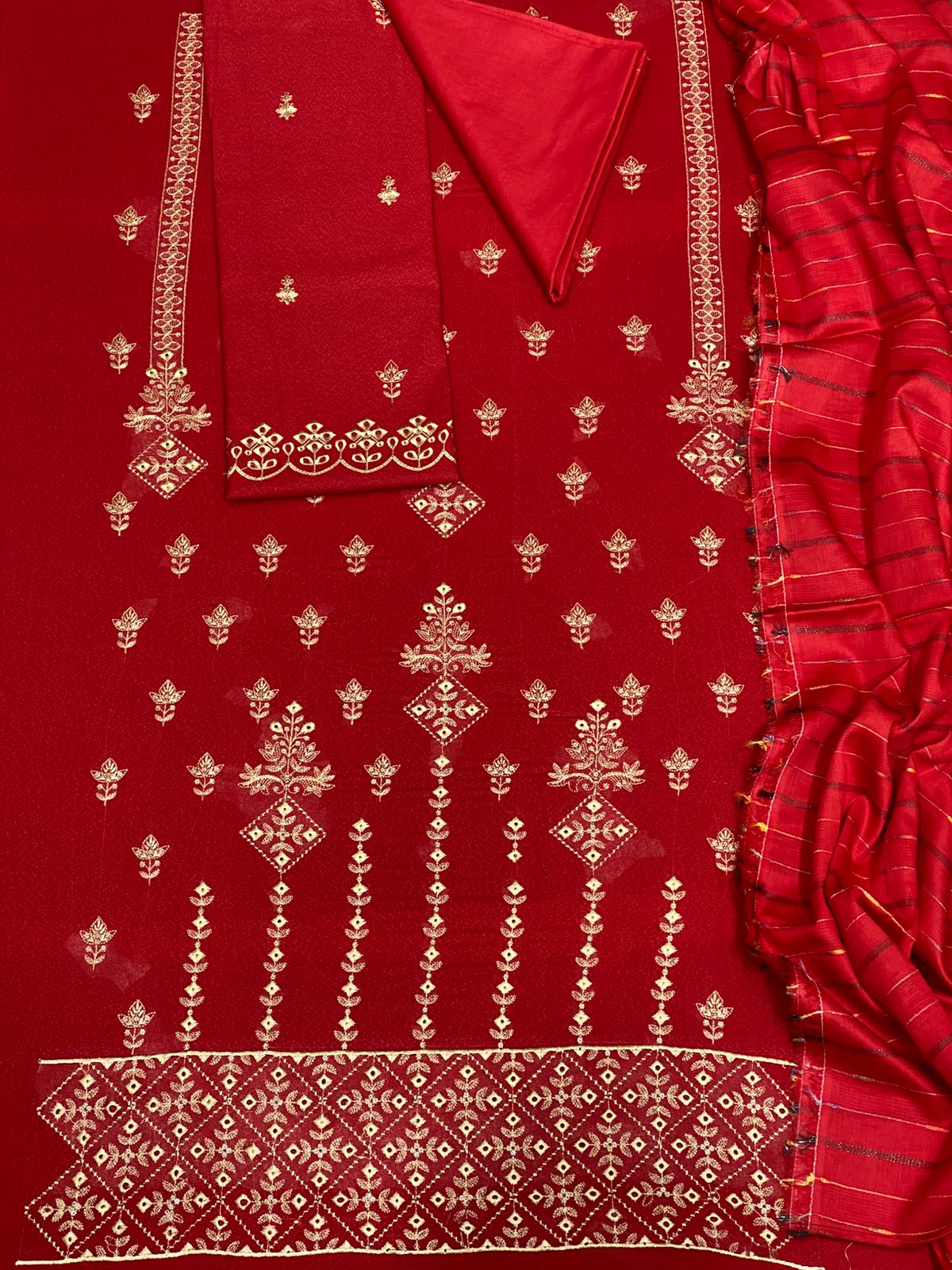 Bin Saeed Red Royal Touch Luxury Karandi 3Pc Embroidered Suit – Design 02