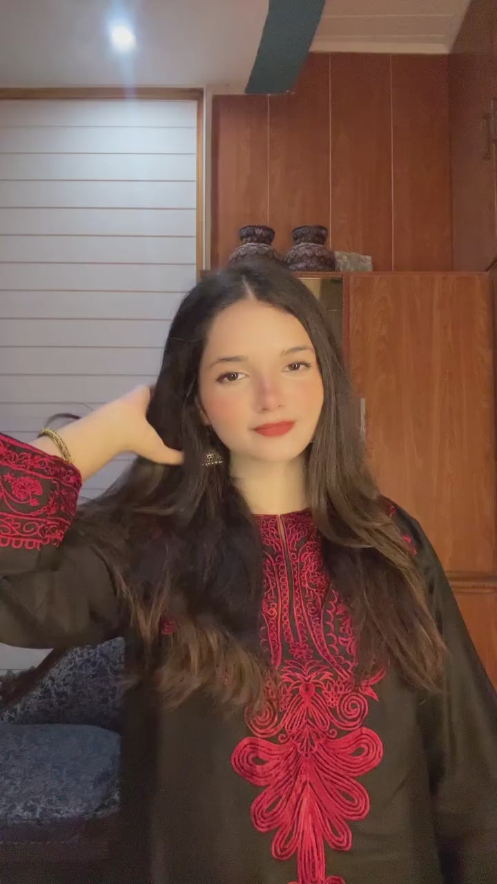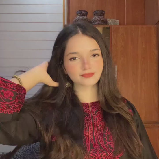 🖤 The rich Jet Black Linen base is beautifully adorned with Crimson Red embroidery on the neckline, sleeves, and trouser border.