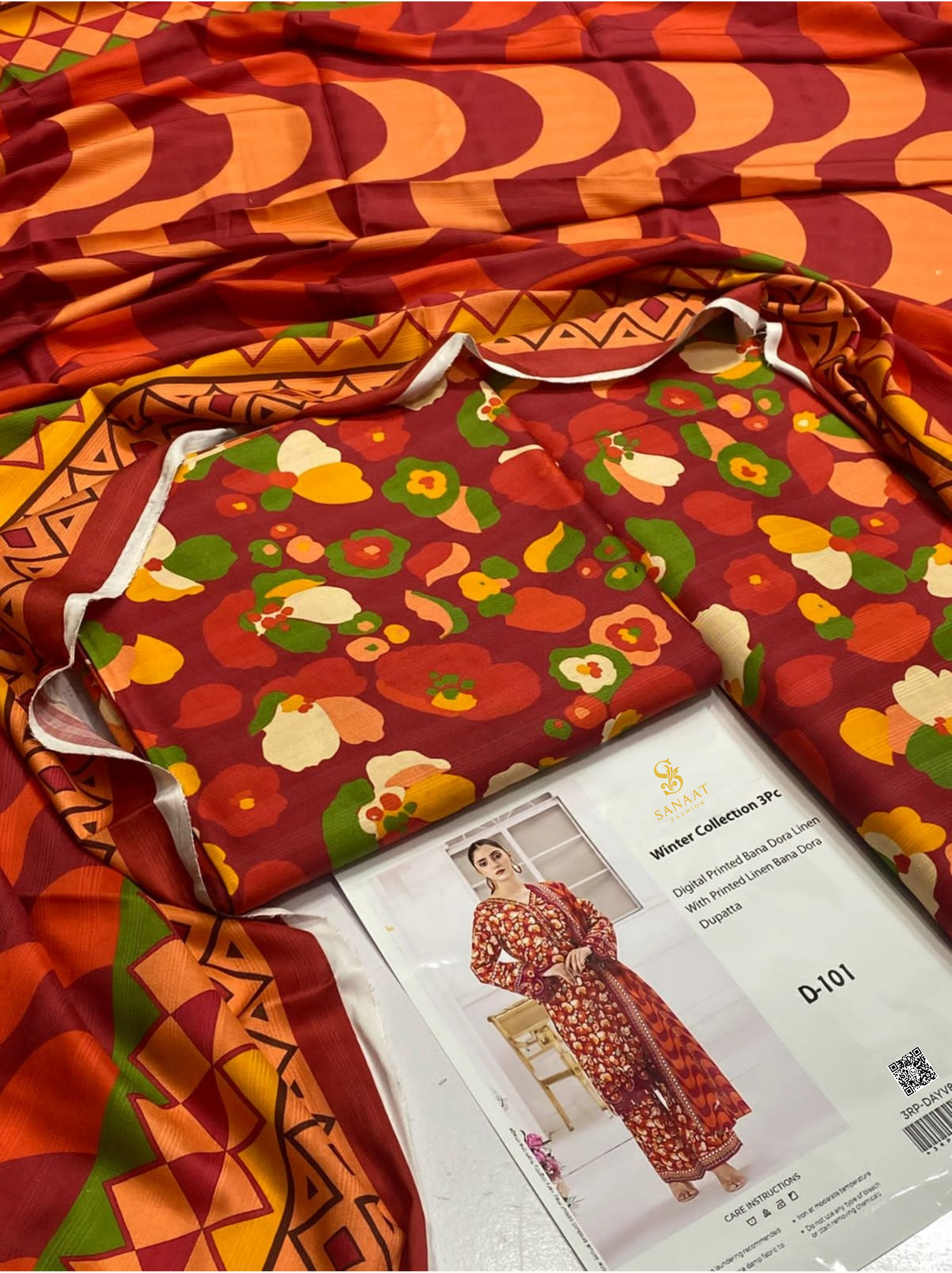 Digital Printed Bana Dora Linen Suit with Dupatta 3Pc (D-101)