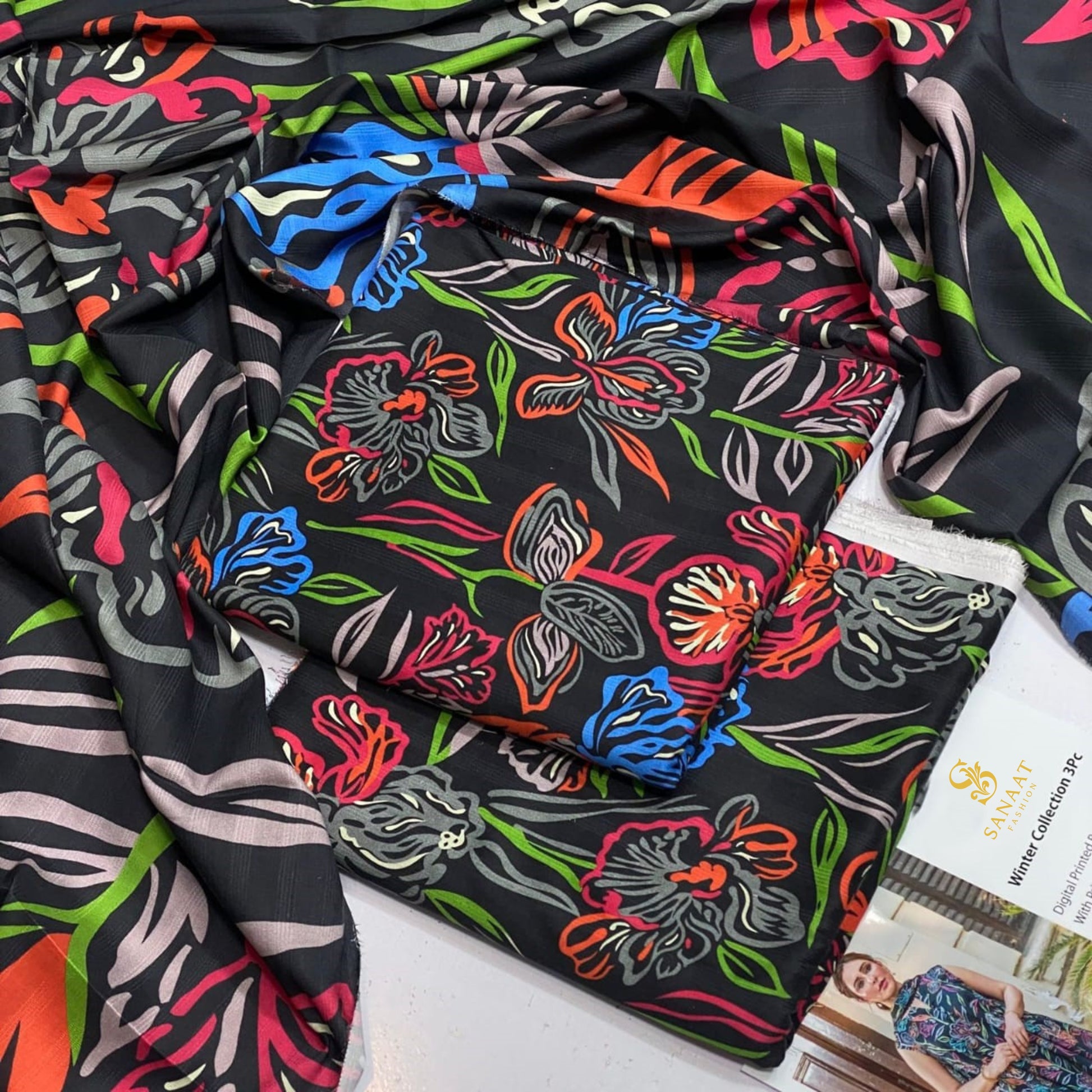 ✨ Bring vibrance to your winter wardrobe with Sanaat Fashion’s D-113 Unstitched 3Pc Suit.