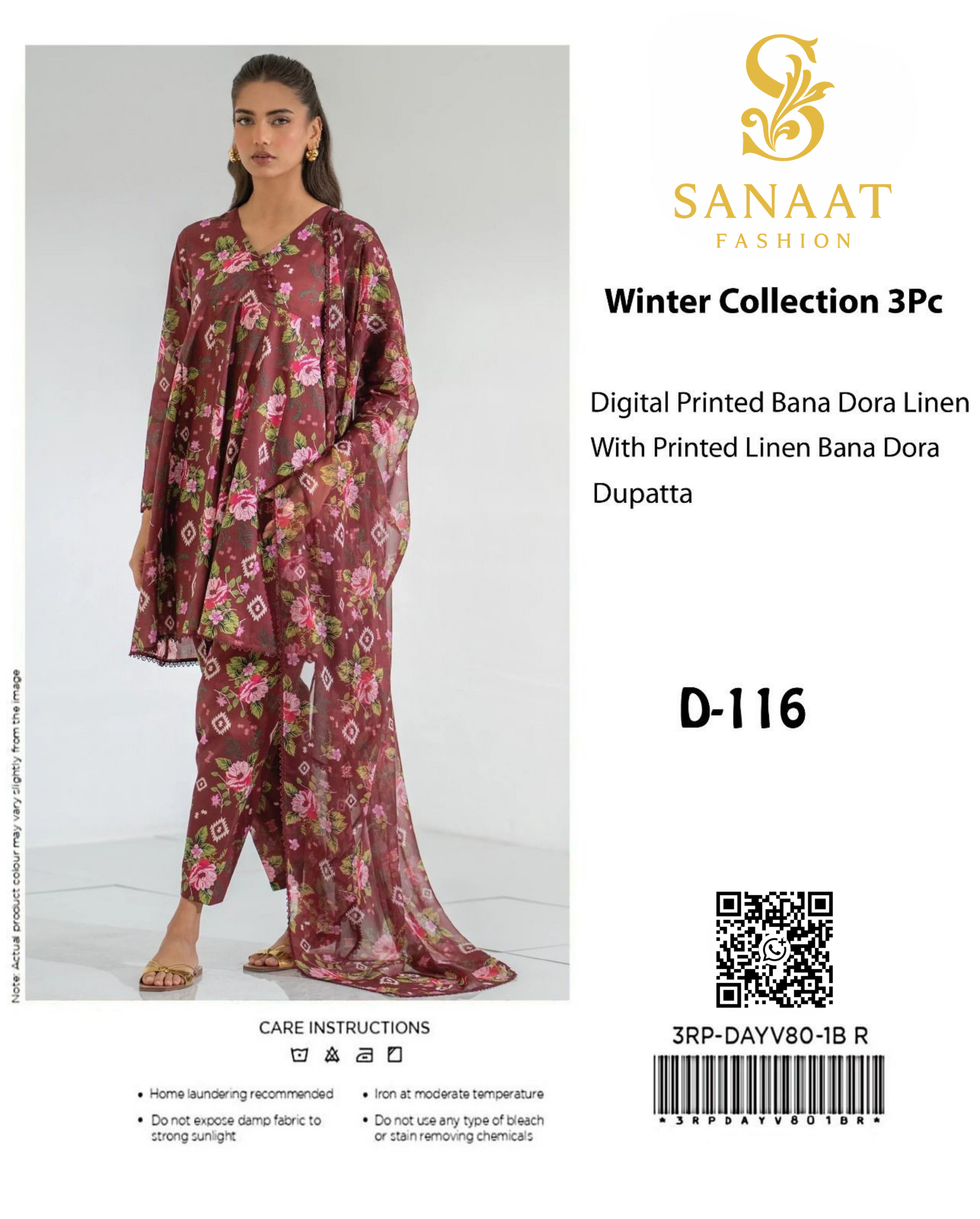 Unstitched Burgundy Floral Bana Dora Linen with Printed Dupatta (D-116) Sanaat Fashion Winter Collection 3Pc ā